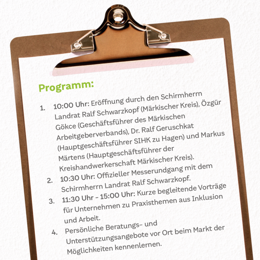 Auf der Messe wird es für alle Interessierten Personen einen Stellenmarkt der Inklusionsunternehmen geben, um direkt vor Ort mögliche Arbeitgebende kennenzulernen. Außerdem wird es ein spanndes Vortrags- und Seminarprogramm geben.